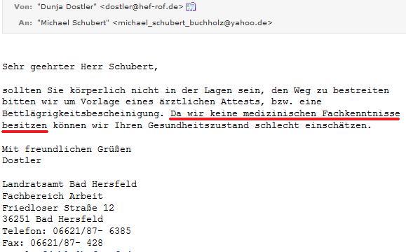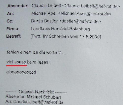 Der Hammer: Unbeabsichtigt habe ich eine interne Mail aus dem Landratsamt Bad Hersfeld erhalten. In einer E-Mail, in der ich Sozialpädagogin Claudia Leibelt verzweifelt meine Schmerzen schilderte und betonte, wie verheerend der Abzug der € 50 für mich ist, da diese verhindern, dass mir das Fahrgeld für Facharztbesuche fehlt, leitete sie diese Mail an ihre Kollegen Dunja Dostler und Michael Apel mit höhnisch-menschenverachtemden Kommentar "Viel Spass beim Lesen" weiter. Damit sich diese mit ihr zusammen amüsieren!