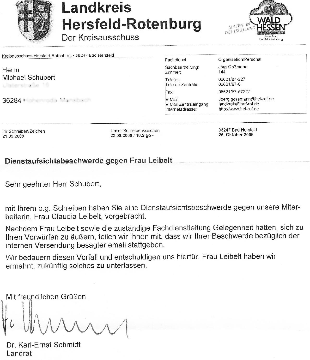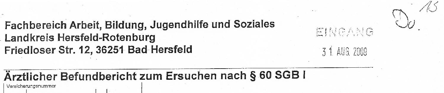 Nachdem ich jahrelang die Schmerzen ertragen habe, jetzt zunächst zur Ruhe kommen und eine Trauma-Therapie beginnen wollte, begann ein unvorstellbarer Behördenterror. Hartz-IV-Sachbearbeiterin Dunja Dostler (Landratsamt, Friedloser Str. 12, 36251 Bad Hersfeld) bestrafte mich nur wenige Tage nach meiner Rückkehr am 4. August 2009 mit dem Abzug von € 50 von der Grundsicherung, weil meine Heizkosten angeblich zu hoch sind, so dass mir nur noch € 309 blieben.