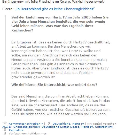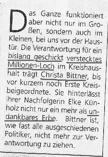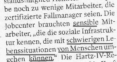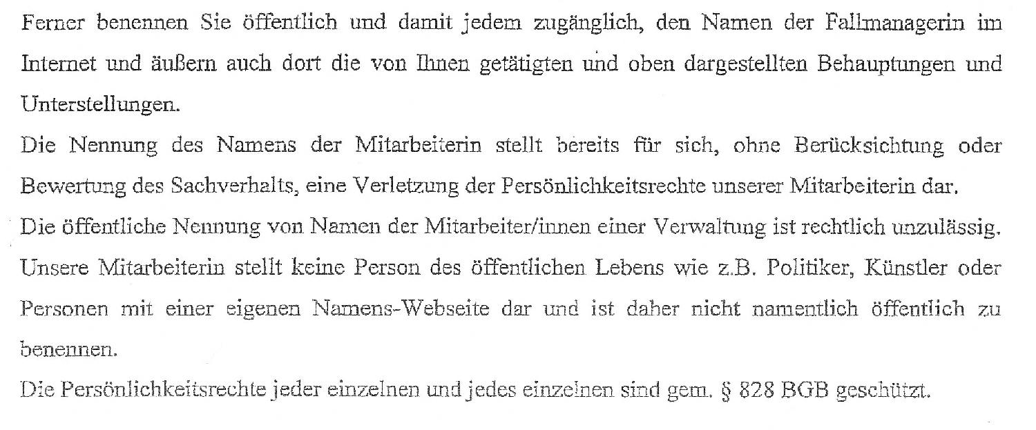 Sozialdezernentin Christa Bittner *) teilte mir am 18. September 2009 mit, dass sich Dostler nur an ihre Dienstanweisungen gehalten habe und sie sich schützend vor sie stellen müsse. Fragt sich nur, wer die Hartz-IV-Bezieher vor den Sachbearbeitern schützt? Abschließend machte Bittner deutlich, dass sie keine Presse/Öffentlichkeit wolle und drohte mit rechtlichen Schritten, wenn ich weiterhin über diesen Fall mit Namensnennung berichte. Peinlich: Sie, die Beigeordnete, belehrt mich mit dem � 828 BGB, der absolut gar nichts mit dem Persönlichkeitsrecht zu tun hat. Hat sie keine Ahnung oder will sie mich mit einem beliebigen Paragraphen einfach nur einschüchtern?