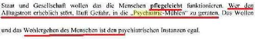 Richter Leimbach interessierte sich nicht dafür, dass Arzt und Pflegepersonal einen Patienten misshandelt haben, auch die Gewalt- und Morddrohungen***), die ich in dieser Zeit erhalten habe, sind für ihn offenbar völlig unwichtig und natürlich auch die nachweislich rechtswidrigen Fehlbescheide der Behörden, die mich in Österreich zwei Winter haben frieren lassen und der Schimmel der nasskalten Wohnung vermutlich meine Lungen angegriffen hat. Für ihn ist nicht bedeutsam, dass jetzt auch in Deutschland fehlerhafte Bescheide für schwerste Existenznot sorgen und ich sogar auf Medikamente verzichten muss. Richter Leimbach sieht offenbar nur eiligen Handlungsbedarf, wenn jemand auf diese Mißstände aufmerksam macht und dagegen protestiert. Dazu passt dieser Aufsatz von Joachim Hellmer (Professor für Strafrecht und Kriminologie und Direktor des Kriminologischen Instituts an der Universität Kiel).