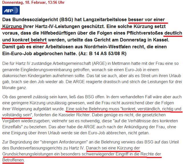 Das Bundessozialgericht urteilte: "Eine Kürzung der Grundsicherungsleistungen sei ein besonders schwerwiegender Eingriff in die Rechte der Betroffenen" - von daher muss vor einer Sanktion eine Belehrung erfolgen, die "konkret, verständlich, richtig und vollständig" zu sein hat. Nichts dergleichen ist in meinem Fall passiert.
