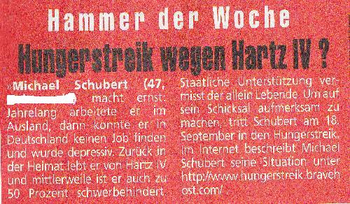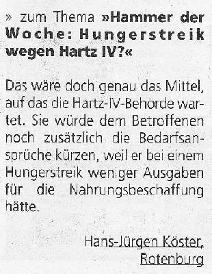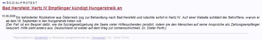 Danach sagte das Amt, es wäre alles nicht so gemeint gewesen. Die Menschen werden von den Behörden in Angst und Schrecken versetzt und wie -in meinem Fall- mit der völligen Existenzlosigkeit bedroht. So hofft man auf einen Anstieg der Suizidzahlen, um Geld sparen zu können. Mein Beispiel zeigt auch, dass es letztendlich nie ein wirkliches Interesse daran gab, dass ich meinen Hungerstreik beende. Gegen einen leisen Suizid hat ja niemand etwas; man will eben nur keine öffentliche Aufmerksamkeit. Es ist der Betroffene selbst, der die Behörden mit ärztlichen Befunden versorgt, in der Hoffnung, Hilfe zu bekommen. Doch die Diagnosen (z.B. Depressionen) werden gegen ihn verwendet und im "Bedarfsfall" dazu benutzt, Angst zu machen; die möglichen Folgen einkalkulierend.