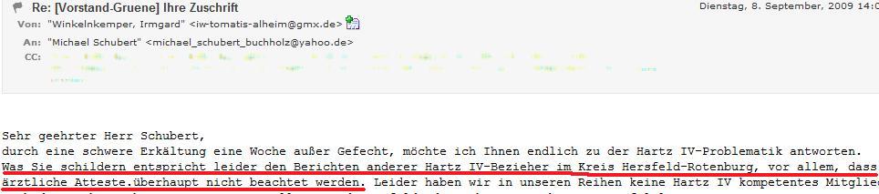 Irmgard Winkelnkemper von den 'Grünen' bestätigt die Schikanen der Hersfelder Behörde und dessen völliges Desinteresse an den medizinischen Befunden der Hartz-IV-Bezieher: