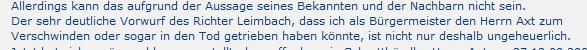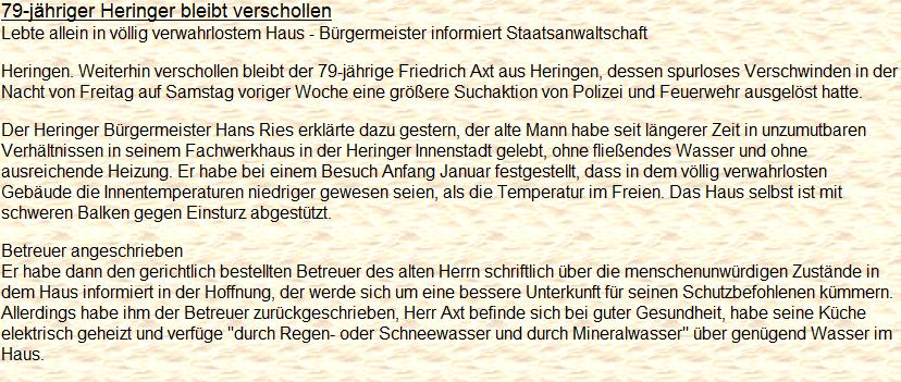 Zudem liegt der Fall des Herrn Axt aus dem benachbarten Heringen erst kurze Zeit zurück (Januar 2009). Axt erhielt einen gerichtlichen Betreuer gegen seinen Willen. Im Januar 2009 wurde er -nachdem er zunächst lange verschollen war- tot aufgefunden. Die immer selben Phrasen: Die Behörden haben alles absolut richtig gemacht; die alleinige Schuld hat das Opfer, das angeblich alle Hilfe abgelehnt und lieber in Schmutz und Dreck gelebt hat. "Selbstverständlich" war der fast 80-jährige Mann aggressiv und ein Querulant. Zuständiger Richter: Dieter Leimbach. Der Mann hatte offenbar panische Angst vor den behördlichen Entscheidungen gegen seinen Willen bzw. vor dem Betreuer und floh in den Schnee, in dem er einsam starb.